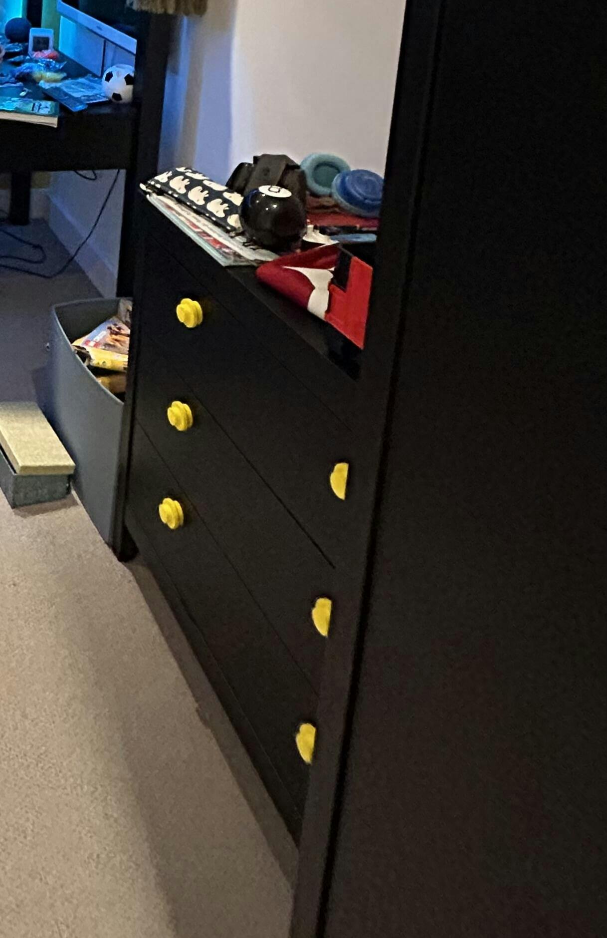 Lego drawer knobs scaled from an original stud, accepts a standard 4mm wood screw, 45mm overall diameter and 29mm deep. Suitable for any single knob drawers, cupboards, chest of drawers, doors, etc.